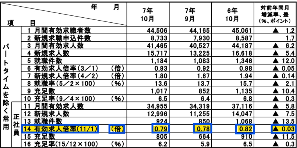 千葉県の10月の正社員有効求人倍率は対前月±0.01Pの0.79倍(千葉労働局)