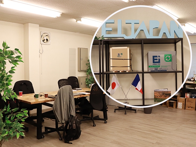 事務所兼休憩スペースは、北欧家具でまとめたキレイな空間。右上に見える箱が、私たちの扱っている製品です。