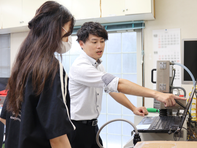 営業は男女問わず活躍中。社内にある機器を操作しながらレクチャーしている風景です。