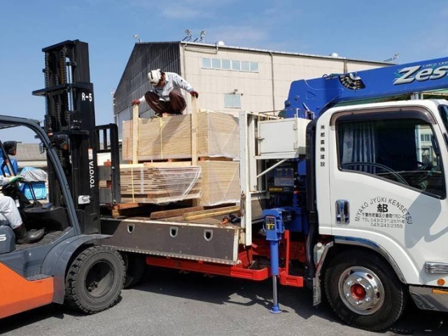 土曜日の木材運搬の様子。現場のスタッフさんたちと協力して荷下ろしします。