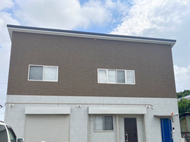 事務所外観。県道69号沿い、白いフェンスに囲まれた所で、砂利の広い駐車場があります。