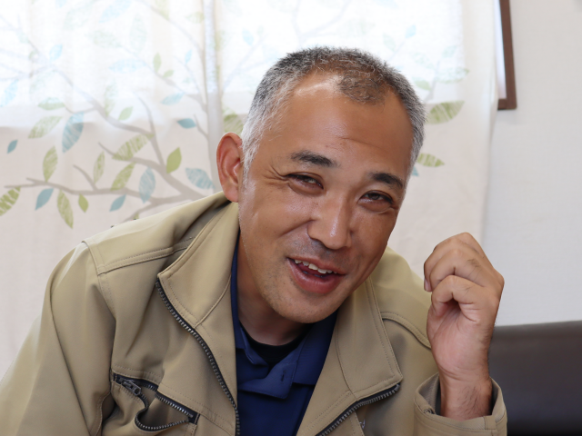 代表の千葉です。写真では「恥ずかしい!」と照れていますが、社員が気軽に話せる人柄で会社の雰囲気も良好なんですよ。