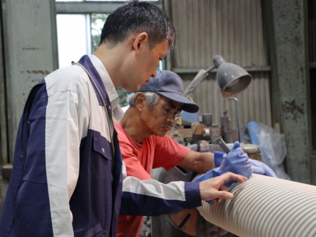 工場のベテランスタッフと製品を見て確認作業の様子。連携しながら、お客様のご要望に応えていきます。