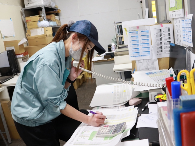 作業場内にある事務所で、生産計画を立て、顧客対応も行っています。