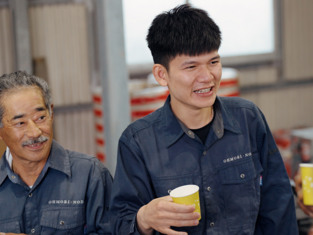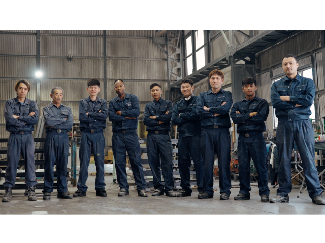 工場のメンバーです。写真はシャキッと、普段は穏やかで優しい仲間が揃っています.