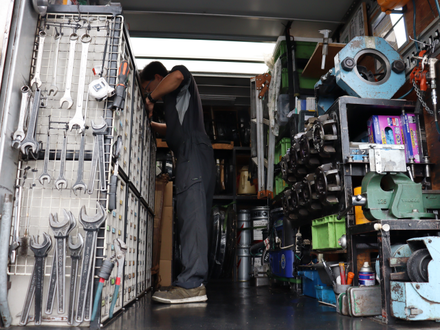 こちらがサービス車の荷台。自分だけの作業スペースになっています。人それぞれ、個性のある空間です。