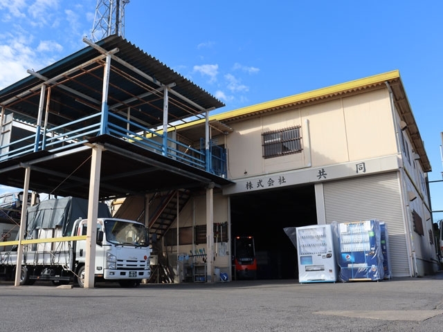事務所の外観と、あなたの愛車になる2tトラックです。事務所の2階のベランダには小休憩スペースも。