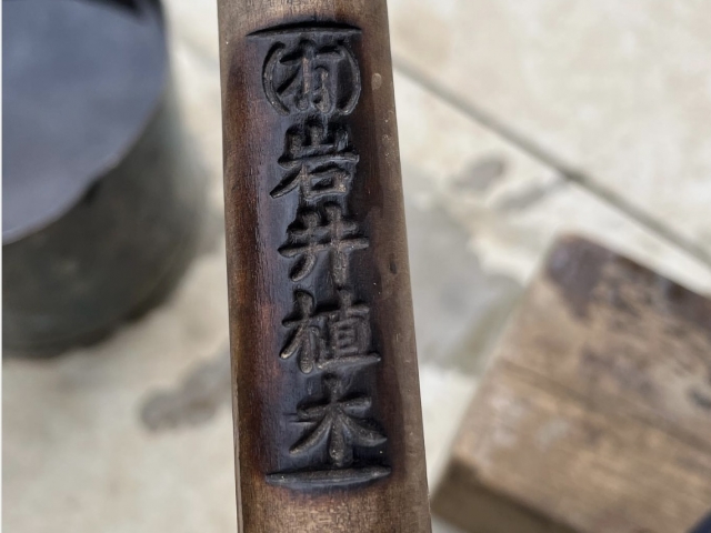 仕事の相棒となる刈り込み鋏。柄には「(有)岩井植木」の刻印があります。