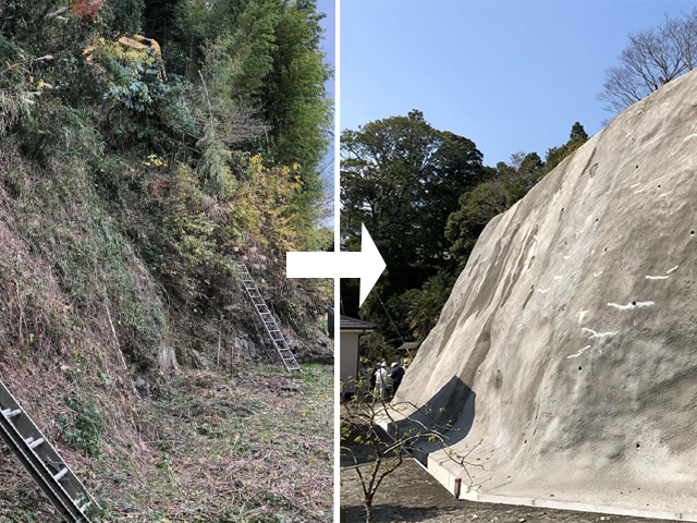 「小規模治山緊急整備工事」の工事前と完成後の様子です。災害時に近くの民家に土砂が流れ込まないようにするための工事です。