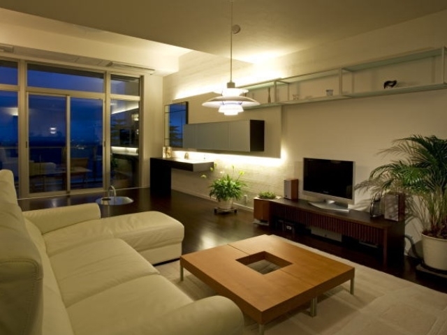 (施工事例)海の見えるリビング。壁に収納とミラーを取り付け、ミラーが外の景色をリビングに取り込みます。