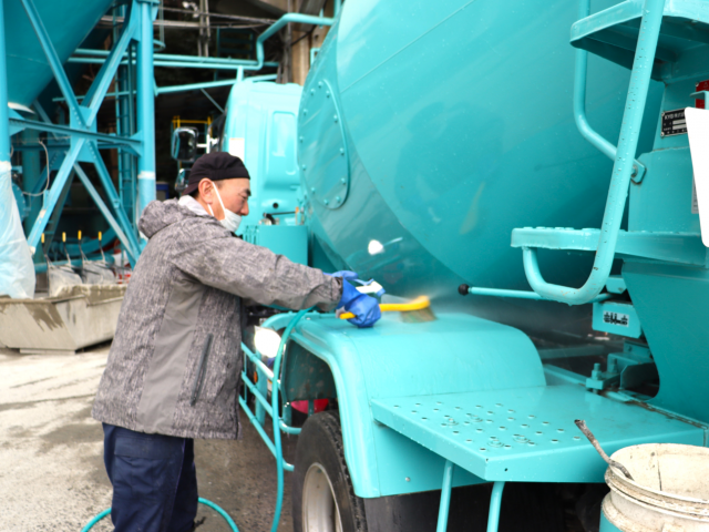洗車でミキサー車を労います。1人1台の専用車なので運転しやすいですし、愛着も湧きます。