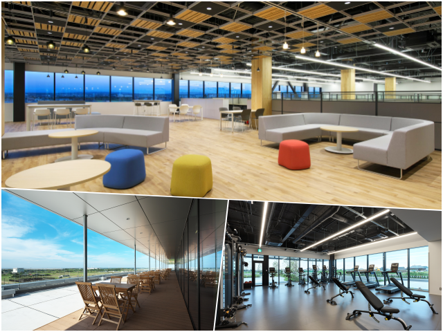 気分転換にオープンスペースで仕事をすることも。ほか、カフェテリアや社内トレーニングジムなども完備しています。