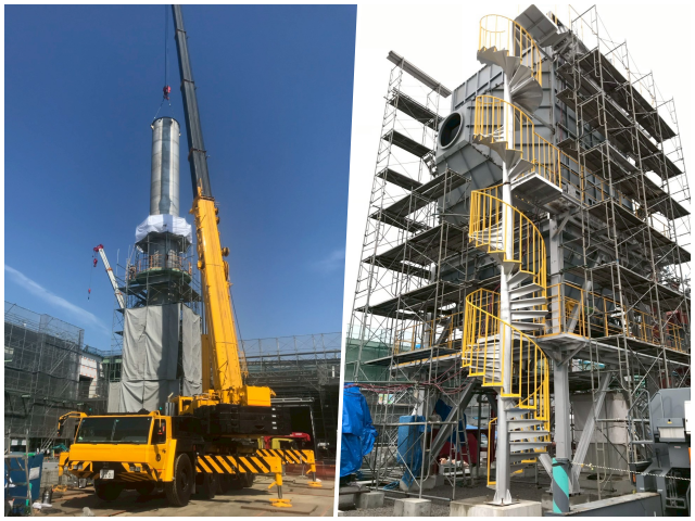 左は煙突の据え付け、右は集塵機。周りの足場も螺旋階段も当社で手がけています。