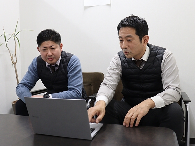 向かって右が社長の伊賀。社員の話に熱心に耳を傾けます。