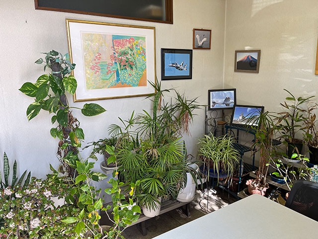 会社の入り口・MTGスペースは多くの緑に囲まれており「造園業」を営む同社らしい雰囲気がありました。また、緑の奥から見える写真たちは、社員の方が趣味で撮影した写真たち。現地にいって撮影した航空機や船の写真を、現像して会社に持ってきてるんです…と、なんだか微笑んでしまうようなお話も伺うことができました。