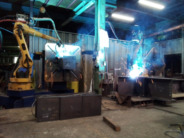 ロボット溶接機で作業中。モノづくりのロマン溢れる仕事です。