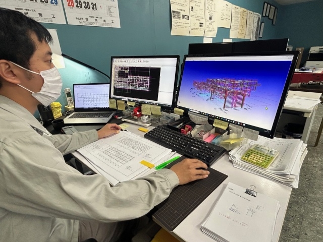建築鉄骨の図面(施工図)作成をお任せします。 【具体的には…】 建築士が作成した設計図をもとに、2次元・3次元の施工図に変換していきます。「元の設計図通りに施工すると、この柱とこの梁、ぶつかっちゃうなあ」というようなことに気づくこともあります。そんなときは設計者に確認して修正したり、様々な調整をしながら、職人の仲間たち(優しくてかっこいい仲間たちです)が正しく製造・施工できるように、施工図を仕上げていきます。 ◆使用ソフト:S/F REAL4(鉄骨専用CADシステム) 業界専門のソフトなので、みんな使うのは初めて。初めは何もわからなくて当然なので、遠慮せずに何でも聞いてください! 【入社後は…】 まずは、CADソフトの使い方から覚えていきましょう。2次元で描いたものが3次元の世界で見える過程など、とても面白いので、楽しみながら仕事を覚えていけます。操作に慣れてきたら、簡単な図面作成から少しずつお任せしていきます。 他にも、付随する事務業務もお任せします。伝票チェック、書類作成など、事務経験がない方でもすぐに慣れていただけるものばかりです。 【資格取得を支援】 製造に関するたくさんの資格取得を支援しています。一つ一つ資格を取得し、スキルアップしていくことで、この道のスペシャリストになることもできますし、自分が作成した施工図で鉄骨をつくり、建物ができていくやりがいを、より幅広く感じられるようになります。もちろん、資格取得手当の支給もあるので、収入もアップ!あなたのがんばりに、会社はしっかり応えていきます! |