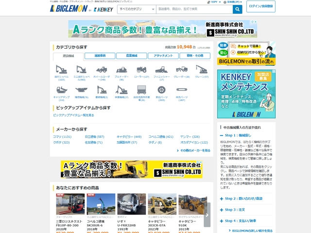 ▼「BIGLEMON」※現在はKENKEY社が運営 https://biglemon.kenkey.jp/ ▼当社運営サイト 「千乃蔵」(建機パーツ販売) https://www.sennokura.jp/ 「Hat10」(中古建機のオークションサイト) https://www.hat10.com/ |