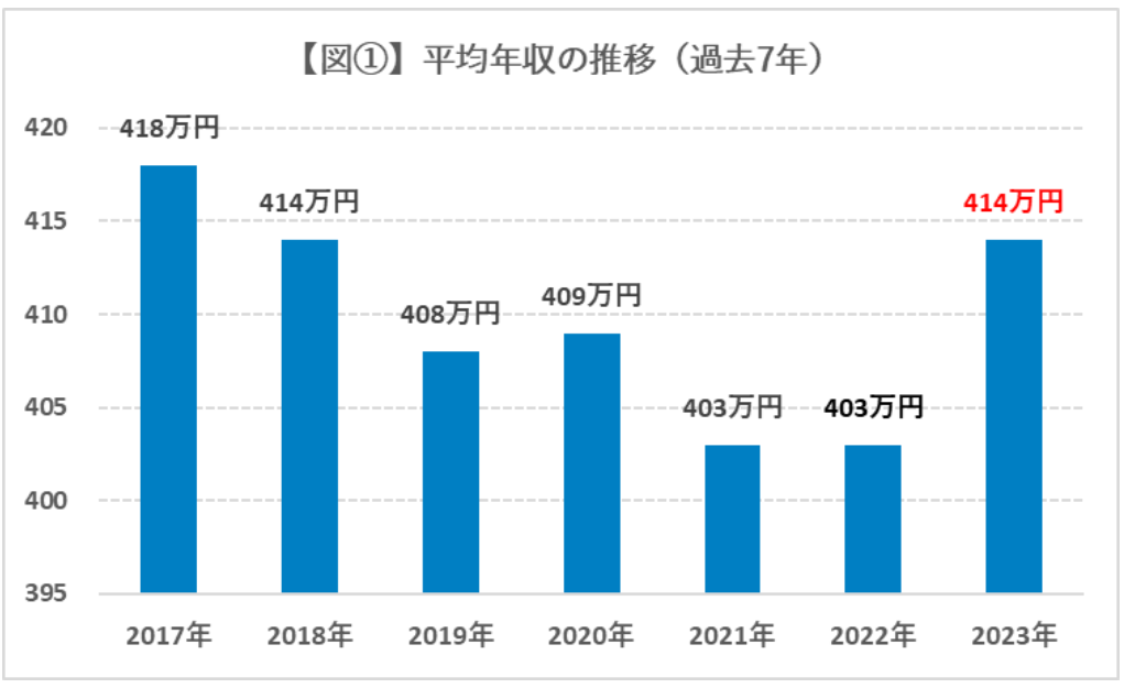 2023年の平均年収は414万円で、前回から11万円アップとのことです。