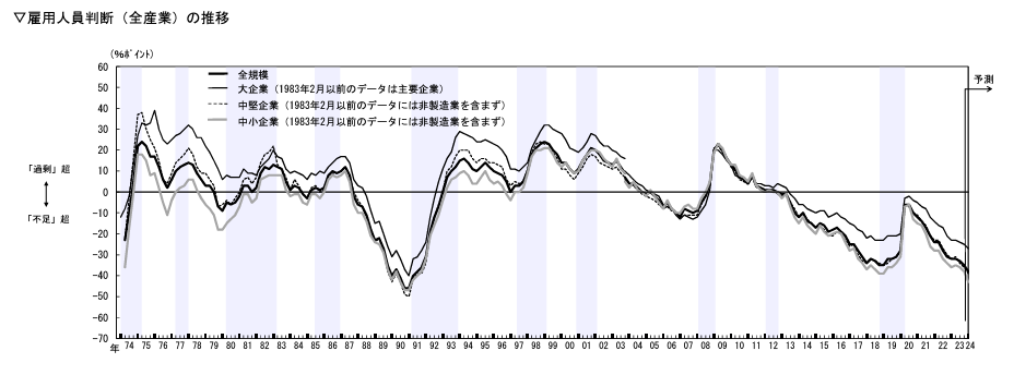 雇用人員判断DIが悪化(日銀短観・2023年12月調査) -2023.12.25- 採用活動に関わる参考記事・データ・ニュースなど 出典:日銀短観(日本銀行・2023年12月13日) 日本銀行が12月の短観を発表しました。 景況感は改善していますが、雇用に関しては、雇用人員判断DIは悪化し、人手不足感が加速しています。中小企業における業種別雇用人員判断DIは以下となっています。(一部抜粋) 日頃のニュースで取り上げられているとおりですが、「宿泊・飲食」「運輸」「建設」などでのマイナス幅が大きいですね。 採用活動に関わる参考記事・データ・ニュースなどトップへ