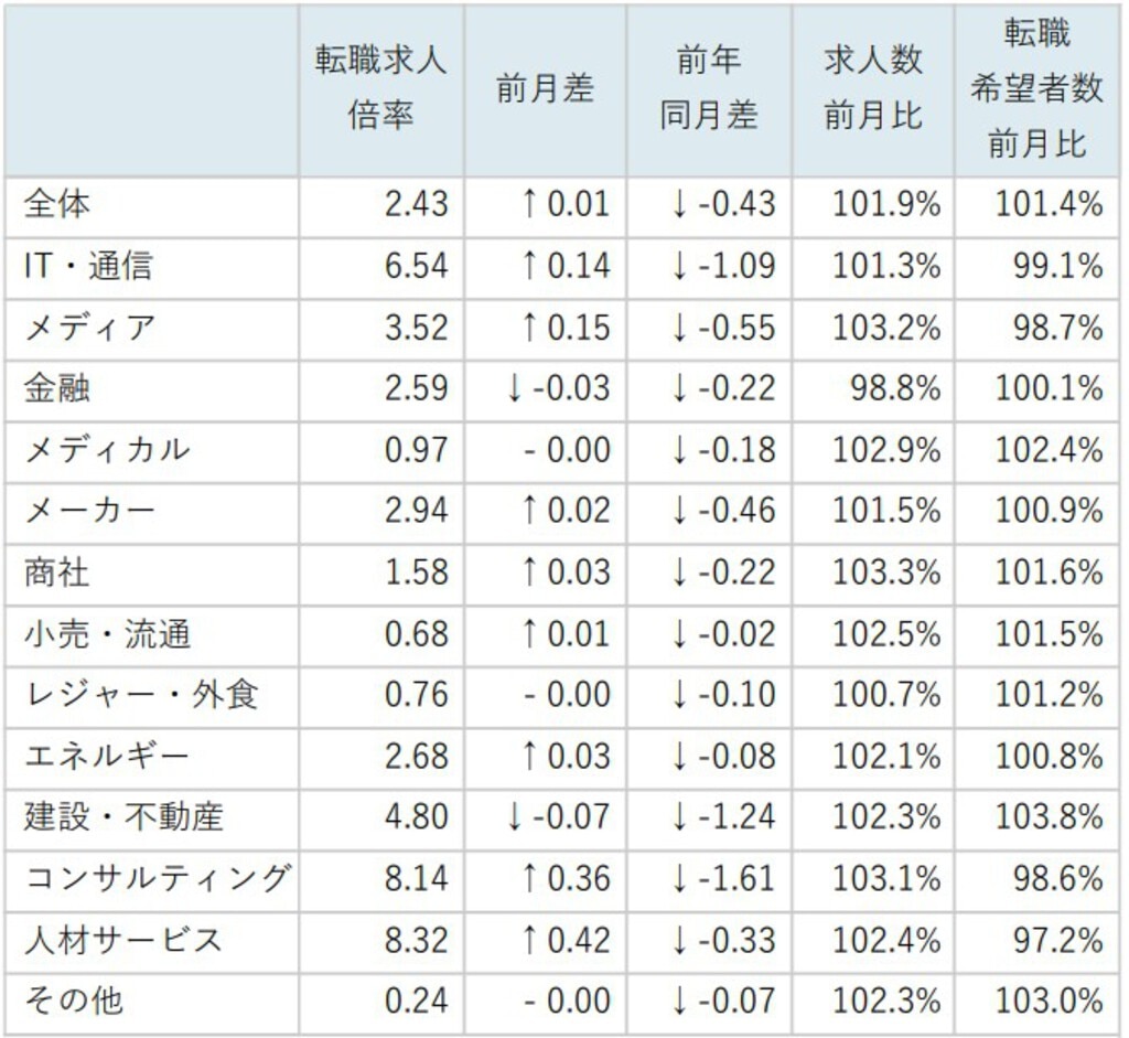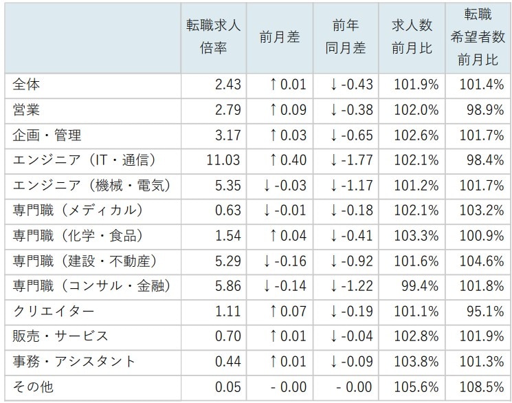 - 転職求人倍率:2.43倍(前月差:+0.01ポイント・前年同月差:-0.43ポイント)