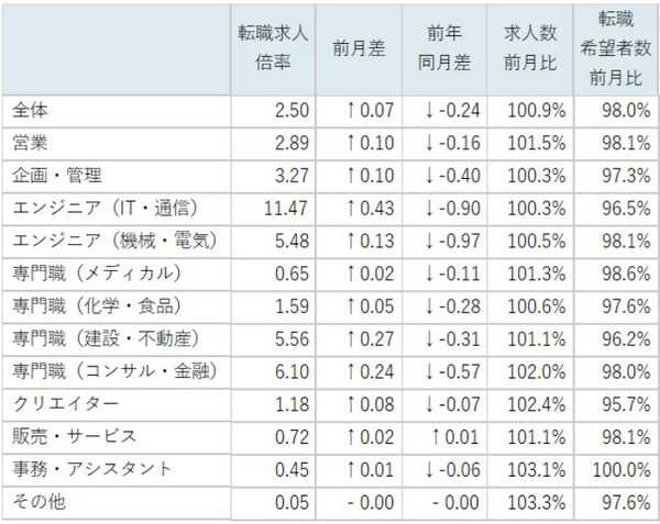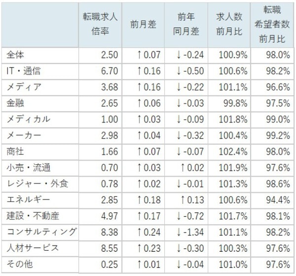 - 転職求人倍率:2.50倍(前月差:+0.07ポイント・前年同月差:-0.25ポイント)