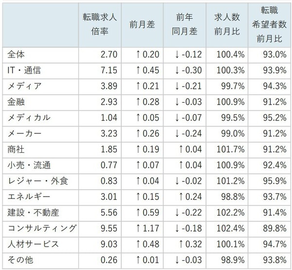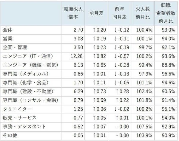 - 転職求人倍率:2.70 倍(前月差:+0.20 ポイント・前年同月差:-0.12 ポイント)